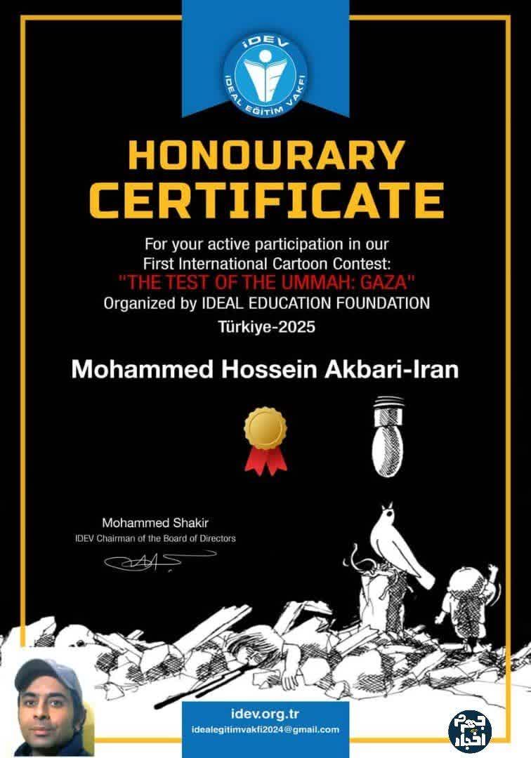 درخشش هنرمند جهرمی در مسابقه بینالمللی کارتون غزه به گزارش اخبار جهرم، «محمدحسین اکبری»، کارتونیست جهرمی، موفق به کسب جایزه افتخار مسابقه بینالمللی کارتون «غزه، آزمایش امت» در ترکیه شد....