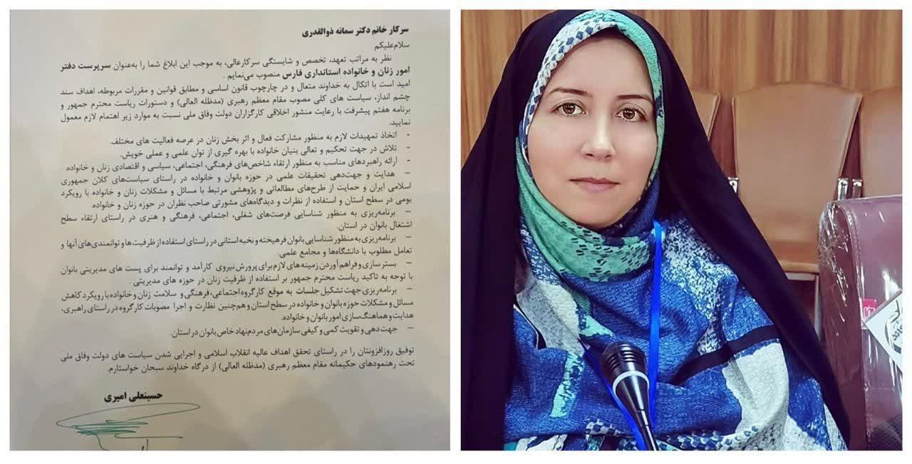 یک بانوی جهرمی، سرپرست دفتر امور زنان و خانواده استانداری فارس منصوب شد به گزارش اخبار جهرم، دکتر حسینعلی امیری استاندار فارس با صدور حکمی سمانه ذوالقدری را به عنوان...