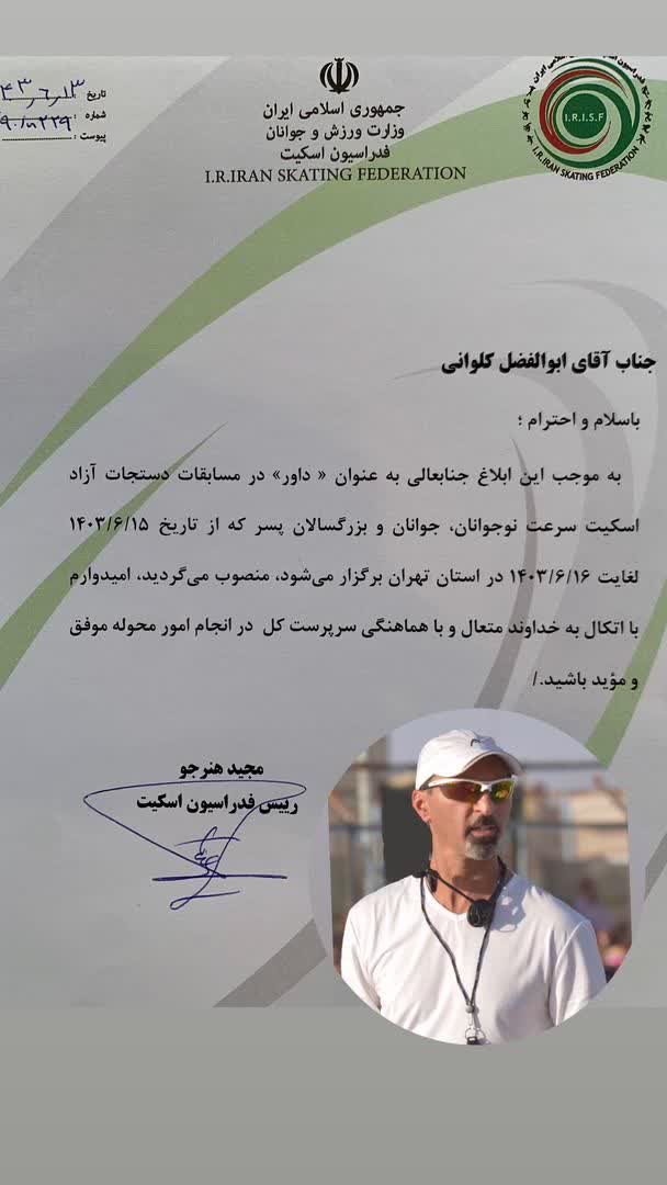 قضاوت داور درجه ۱ جهرمی، در مسابقات کشوری دستجات آزاد اسکیت سرعت به گزارش اخبار جهرم، مسابقات کشوری دستجات آزاد اسکیت سرعت، در رده نوجوانان، جوانان و بزرگسالان، در تاریخ...