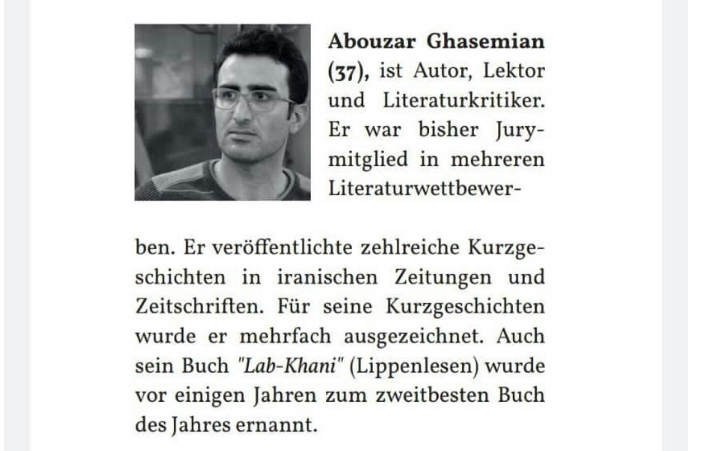 داستان «بازی در مدارِ بسته» از ابوذر قاسمیان نویسندهی جهرمی، با عنوان «Der tote winkel» به معنای «نقطهی کور» با ترجمهی آرش البرز و به ویراستاری «ورونیکا رومَن» در فصلنامهی «Dort» منتشر شد.