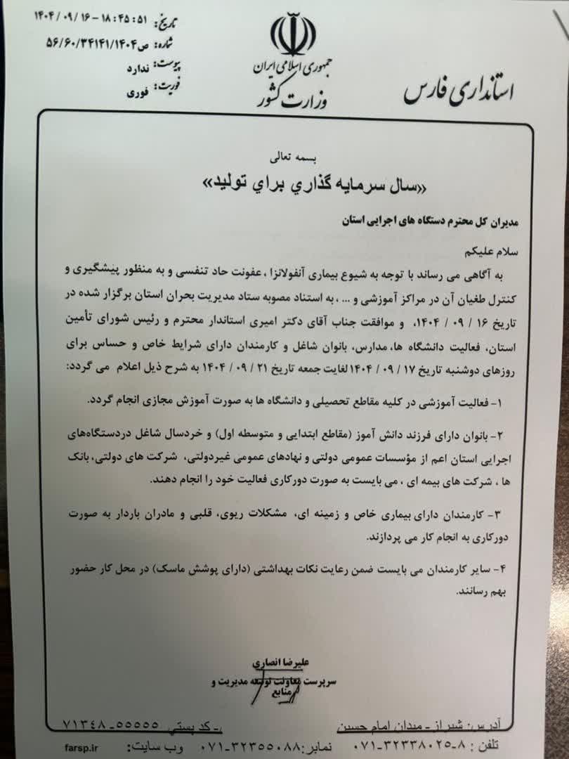 تعطیلی مدارس فقط تا پایان هفته جاری خواهد بود و تمدید نمیشود به گزارش اخبار جهرم، با شیوع نسبی آنفولانزا در برخی مناطق استان فارس، مدارس این استان تا پایان...