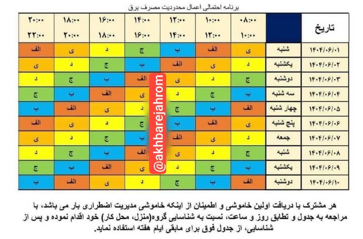 جدول جدید خاموشی شهرستان جهرم از تاریخ یکم شهریور تا ۱۰ شهریور ۱۴۰۴ اعلام شد به گزارش اخبار جهرم، روابط عمومی مدیریت توزیع برق شهرستان جهرم: به اطلاع مردم شریف...
