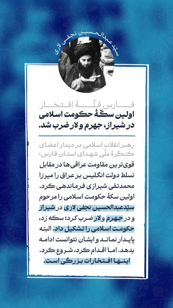 اولین سکه حکومت اسلامی در شیراز، جهرم و لار ضرب شد رهبر معظم انقلاب اسلامی در دیدار اعضای کنگرهی ملی شهدای استان فارس: اوّلین سکّهی حکومت اسلامی را مرحوم سیّدعبدالحسین...