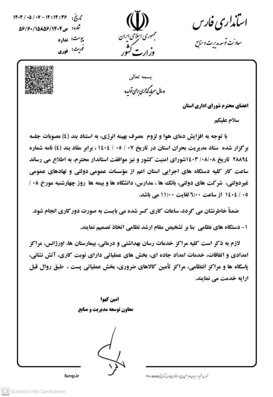 ساعت کار ادارات فارس در روز چهارشنبه ۸ مردادماه ۱۴۰۴ ۶ تا ۱۱ صبح اعلام شد. به گزارش اخبار جهرم، استانداری فارس: با توجه به شرایط خاص و بهمنظور مدیریت...