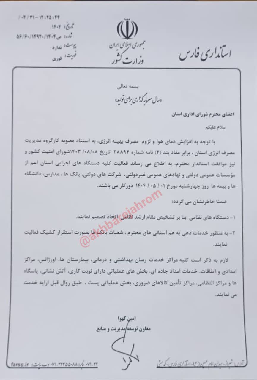 ادارات فارس فردا تعطیل شدند به گزارش اخبار جهرم، معاون هماهنگی امور عمرانی استانداری فارس از تعطیلی ادارات دولتی و بانکهای استان در روز چهارشنبه، یکم مردادماه ۱۴۰۴ خبر داد.
