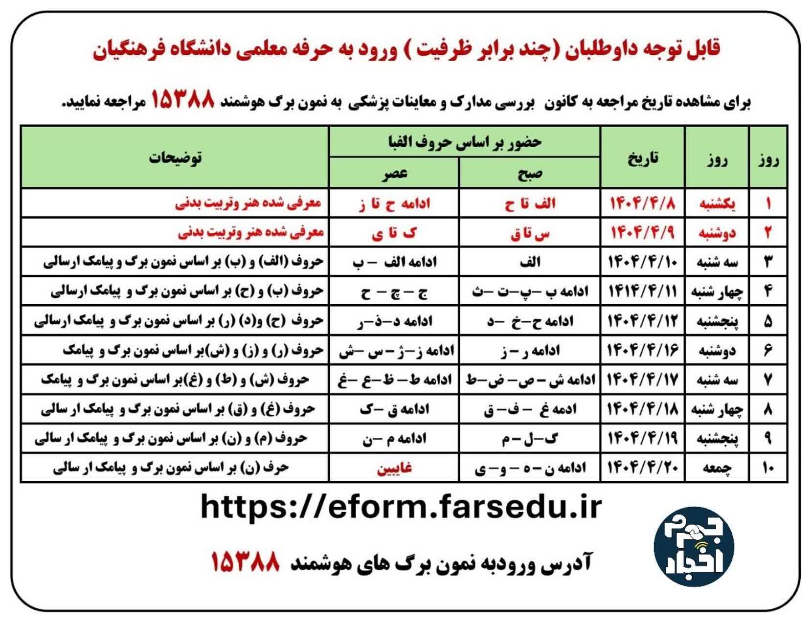 جدول زمان بندی مراجعه داوطلبان چند برابر ظرفیت ورود به حرفه معلمی سال۱۴۰۴ دانشگاه فرهنگیان در فارس