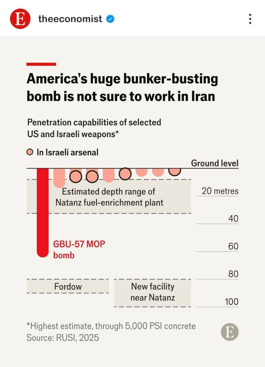 اکونومیست: بمبهای سنگرشکن آمریکا برای نابودی تأسیسات هستهای فردو کارآمد نخواهد بود